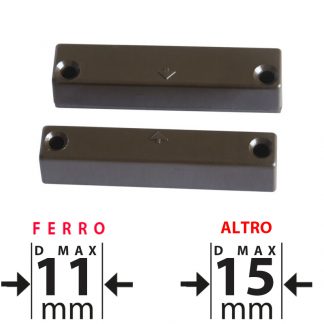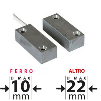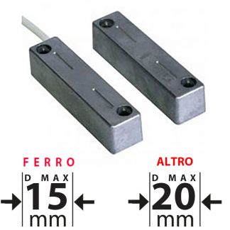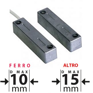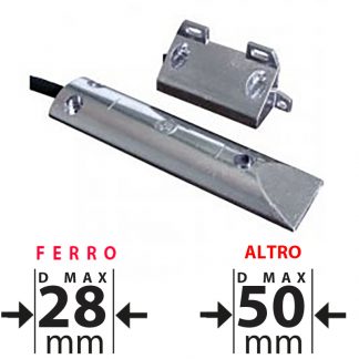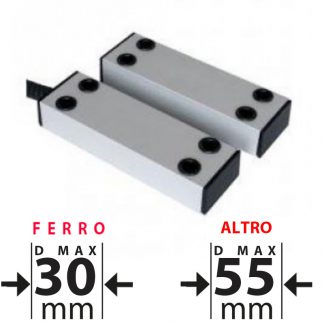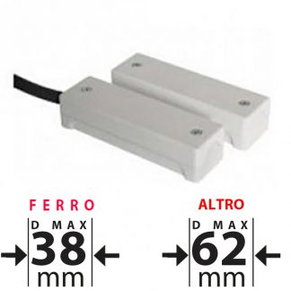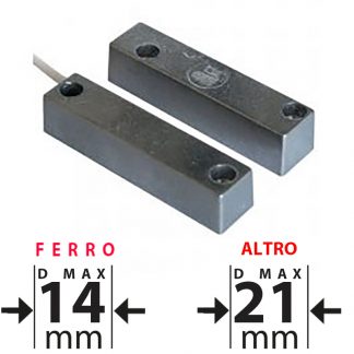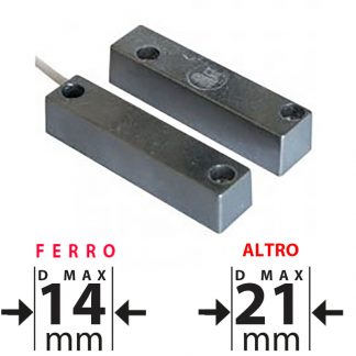 Contatto magnetico in alluminio anodizzato per il montaggio a vista IP40. Distanza massima di lavoro 55mm no ferro, 30mm ferro. Studiato per avere una distanza di lavoro molto elevata per l'utilizzo in tutte quelle applicazioni in cui le condizioni degli infissi danno luogo a elevati giochi e tolleranze. Applicabile su infissi di qualsiasi materiale, anche ferroso. Lunghezza cavo 2,0mt. Funzionamento con contatto reed uscita NC con magnete vicino. Connessione a filo a morsetti (2 per contatto + 2 per tamper). Dimensioni LxHxP 114x35x20mm. Tappi antisvitamento, guaina di protezione cavo diam. 10mm - lungh. 1,7mt in acciaio ricoperto da PVC nero, fili tamper in dotazione.