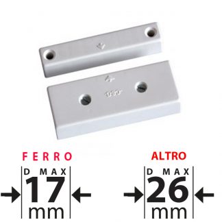 Contatto magnetico in alluminio pressofuso. Distanza di lavoro 30 mm no ferro, 22 mm ferro. Tappi antirimozione e viti di fissaggio compresi. Collegamento con morsetti per contatto di allarme e tamper. Certificato EN50131-2-6 grado 2 classe II. Temperatura di lavoro -10...+40°C. Dimensioni LxHxP 80x18x18mm. Prezzo riferito al singolo contatto. Venduto in confezione da 2 pezzi.