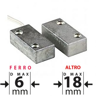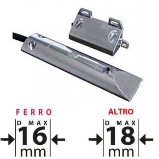 Contatto magnetico in alluminio pressofuso IP65 per porte basculanti o scorrevoli, bilanciato magneticamente per ridurre la possibilità di effrazione con magnete esterno. Distanza massima di lavoro 18mm no ferro, 16mm ferro. La robusta struttura del contenitore completamente in alluminio garantisce la massima resistenza al passaggio delle ruote di automezzi pesanti e rende questo contatto adatto agli impieghi più gravosi. La parte reed si fissa a pavimento con tre viti, mentre la parte magnete si fissa sulla porta. Le ampie distanze d'intervento ne garantiscono il funzionamento anche con porte dai giochi elevati. La parte reed contiene una ampolla reed incapsulata ermeticamente con resina poliuretanica insieme ad un loop di tamper per ridurre le possibilità di effrazione. Funzionamento con contatto reed uscita NC con magnete vicino. Connessione a filo 2 per contatto + 2 per tamper. Lunghezza cavo 2mt. Dimensioni LxHxP contatto 180x45x14mm, LxHxP magnete 92x46x30mm. Guaina di protezione cavo diam. 10mm. lungh. 1mt. in acciaio ricoperto da PVC nero, fili tamper in dotazione