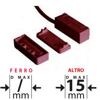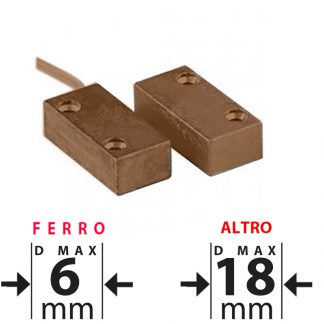 Contatto magnetico in termoplastico MARRONE IP65 per montaggio da incasso o a vista. Distanza massima di lavoro 15mm no ferro. Massima versatilità di installazione (ideale per kit antifurto forniti completi). Si può montare ad incasso inserendo a pressione i corpi cilindrici in fori da 8mm di diametro, oppure a vista con l'utilizzo degli appositi adattatori, con viti a scomparsa, in dotazione. Adatto per il montaggio su infissi di alluminio, legno, PVC e in genere infissi di materiale non ferromagnetico. La parte reed contiene un'ampolla reed incapsulata ermeticamente con resina poliuretanica insieme ad un loop di tamper per ridurre le possibilità di effrazione. Funzionamento con contatto reed uscita NC con magnete vicino. Connessione a filo co guaina: 2 per contatto + 2 per tamper. Lunghezza cavo 2mt. Dimensioni LxHxP 45x16,5x15mm. Il prezzo si riferisce al singolo contatto. Venduto in confezione da 10 pezzi