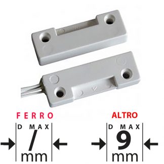 Contatto magnetico in SCAMBIO in termoplastico bianco per montaggio a vista IP65. Distanza massima di lavoro 9mm no ferro. Adatto per il montaggio su infissi di alluminio, legno, PVC e in genere infissi di materiale non ferromagnetico. Connessione a filo (3 per contatto in scambio + 2 per tamper). Lunghezza cavo 0,3mt. Dimensioni LxP 40x7,5mm. Il prezzo si riferisce al singolo contatto. Venduto in confezione da 10 pezzi