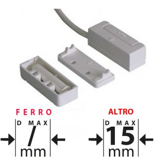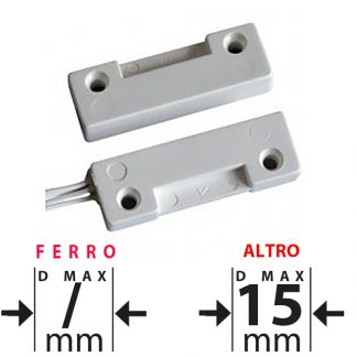 Contatto magnetico in termoplastico bianco per montaggio a vista IP65. Distanza massima di lavoro 15mm no ferro. Adatto per il montaggio su infissi di alluminio, legno, PVC e in genere infissi di materiale non ferromagnetico. Funzionamento con contatto reed uscita NC con magnete vicino. Connessione a filo (2 per contatto + 2 per tamper). Lunghezza cavo 0,3mt. Dimensioni LxP 40x7,5mm. Il prezzo si riferisce al singolo contatto. Venduto in confezione da 10 pezzi