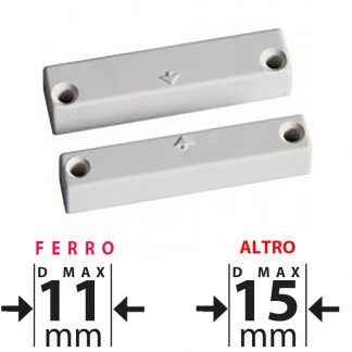 Contatto magnetico in termoplastico per montaggio a vista IP40. Distanza massima di lavoro 15mm no ferro, 11mm ferro. Adatto per il montaggio su infissi di qualsiasi materiale. Funzionamento con contatto reed uscita NC con magnete vicino. Connessione a 2 morsetti. Dimensioni LxHxP 60x13,5x13mm, magnete LxHxP 60x11x13mm. Il prezzo si riferisce al singolo contatto. Venduto in confezione da 10 pezzi