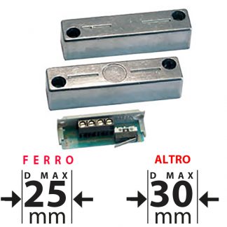 Contatto magnetico in materiale plastico caricato vetro per porte basculanti o scorrevoli. Distanza massima di lavoro 25mm no ferro, 18mm ferro. Connessione a filo 2 per contatto + 2 per tamper. Certificazione EN50131-2-6 grado 2 classe IV. Lunghezza cavo 1,2mt. IP65. Temperatura di lavoro -25...+60°C. Dimensioni contatto LxHxP 85x38x13mm, dimensioni magnete LxHxP 50x26x25mm. Guaina di protezione cavo in acciaio ricoperto da PVC nero lunghezza 1mt in dotazione. Prezzo riferito al singolo contatto. Venduto in confezione da 2 pezzi.