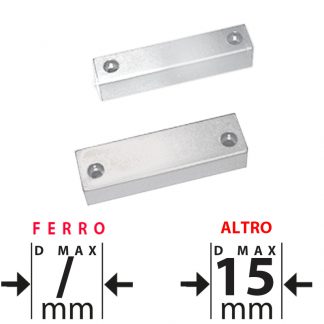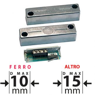 Contatto magnetico in alluminio pressofuso IP34 per il montaggio a vista. Distanza massima di lavoro 20mm no ferro, 15mm ferro. Grazie alla robusta struttura è adatto per impieghi in industrie, centri commerciali, ecc... La grande distanza di funzionamento ne permette l'utilizzo su infissi di qualsiasi materiale e con giochi elevati. Funzionamento con contatto reed uscita NC con magnete vicino. Connessione a morsetti (2 per contatto + 2 per tamper) con protezione contro lo strappo e circuito stampato in grado di alloggiare eventuali resistenze di bilanciamento. Dimensioni LxHxP 80x19x18mm. Il prezzo si riferisce al singolo contatto. Venduto in confezione da 2 pezzi