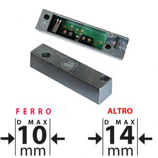 Contatto magnetico in alluminio IP65 per porte basculanti o scorrevoli. Distanza massima di lavoro 40mm no ferro, 32mm ferro. La robusta struttura del contenitore completamente in alluminio garantisce la massima resistenza al passaggio delle ruote di automezzi pesanti e rende questo contatto adatto agli impieghi più gravosi. Funzionamento con contatto reed uscita NC con magnete vicino. Connessione a filo (2 per contatto + 2 per tamper). Lunghezza cavo 1,2mt. Dimensioni LxHxP 140x42x15,5mm, magnete LxHxP 86x32x25mm. Dotazione: tappi antisvitamento, guaina di protezione cavo diam. 10mm in acciaio ricoperto da PVC nero, fili tamper.