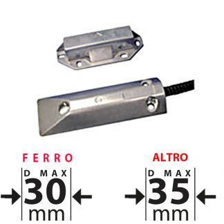 Contatto magnetico in alluminio pressofuso per porte basculanti o scorrevoli. Distanza massima di lavoro 35mm no ferro, 30mm ferro. Connessione a filo 2 per contatto + 2 per tamper. Certificazione EN50131-2-6 grado 2 classe IV. Lunghezza cavo 1,2mt. IP65. Temperatura di lavoro -25...+60°C. Dimensioni contatto LxHxP 130x42x15mm, dimensioni magnete LxHxP 98x30x25mm. Guaina di protezione cavo in acciaio lunghezza 1mt in dotazione.