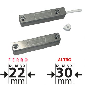 Contatto magnetico in SCAMBIO per superficie di media portata omologato IMQ con la normativa europea EN50131-2-6 grado 2 classe ambientale IV. Distanza di lavoro 30 mm no ferro, 22 mm ferro. Contatto N.C. con anta chiusa . Contenitore in alluminio pressofuso di elevata resistenza per l’installazione su porte in materiali ferromagnetici e non. Disponibile anche nella versione con contatto di scambio. Nella confezione sono inclusi tappi antirimozione delle viti di fissaggio. Collegamento con cavo a 4 fili di lunghezza 120 cm. Prezzo riferito al singolo contatto. Venduto in confezione da 2 pezzi.