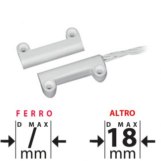 Contatto magnetico IN SCAMBIO di media portata Distanza di lavoro 18mm. Montaggio a vista per l’installazione su porte e serramenti non ferro. Contenitore in ABS. Certificazione EN50131-2-6 grado 2 classe II. Temperatura di lavoro -25...+60°C. Dimensioni LxHxP 32x8x13mm. Prezzo riferito al singolo contatto. Venduto in confezione da 10pz.