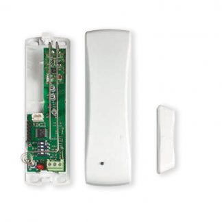 Contatto magnetico BIANCO radio monocanale 868 MHz FSK (compatibile con centrale dualband), supervisionato, segnalazione di stato. Per infissi non metallici. Tamper antiapertura. Assorbimento a riposo: 5 μA, assorbimento in trasmissione: 40 mA. Dimensioni LxHxP 81x34x19 mm. Batteria al litio SBT08 3,6V 1,2Ah in dotazione.