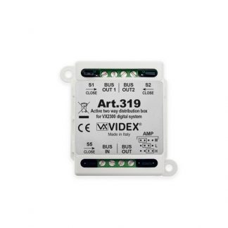 Distributore video attivo, 2 out per sistema VX2300. L’unità distribuisce il segnale BUS su 2 uscite ciascuna da collegare ad un citofono o videocitofono. Il jumper AMP permette di regolare l’amplificazione: per facilitare la regolazione sono contrassegnate le posizioni corrispondenti ad un livello di amplificazione medio (M), basso (L) e alto (H). L’amplificazione non interviene sull’uscita passante BUS OUT. L’Art. 319 ha anche la funzione di isolare le uscite dalla linea principale in caso di corto circuito su una di esse: questo evita che l’intero sistema venga compromesso in caso di corto circuito all’interno di uno degli appartamenti. Dimensioni: 62 x 66 x 22 mm.
