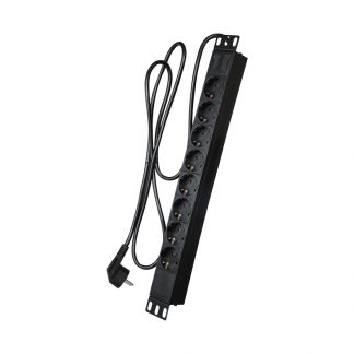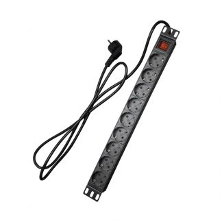 Presa di corrente multipla progettata per rack standard da 19", 8 uscite fino a 250VAC / 16 A max. Dimensione 1U per facilitare l'installazione. Interruttore automatico di sicurezza. Colore nero.