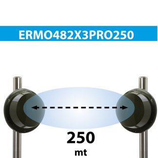 Ermo 482X PRO 250mt versione 3.0. Banda K 24GHz. Barriera a microonde intelligente per portate fino a 250m con banda X e K. Analisi Fuzzy di segnali digitalizzati. 16 canali di codifica. Uscite a relè separate per intrusione, manomissione e guasto. Linea seriale per gestione software Locale/Remota. 2 ingressi bilanciati supplementari, per raccolta altri sensori. Test, Stand-by, sincronismo. Strumento di puntamento, taratura e walk-test incorporato. IP READY & PoE opzionale. E’ dotato di interfaccia per la raccolta allarmi su bus seriale (RS485) oppure è possibile equipaggiarlo con modulo IP-DOORWAY-S per la raccolta allarmi over IP e allo stesso tempo alimentarlo con Power Over Ethernet. Queste funzioni permettono di controllare a distanza il dispositivo attraverso il software WAVE-TEST2. Certificato 3° livello IMQ e FCC. Alloggio interno per batteria da 12Vcc, 2,2Ah. Kit ganasce per fissaggio a palo comprese nella confezione. IP66. Temperatura di lavoro -35...+70°C. Dimensioni ØxP 300x350mm. Peso TX 2,9Kg, RX 3Kg. Alimentazione 17...21Vac, 11,5...14,8Vcc, PoE, 120mA TX+RX.
