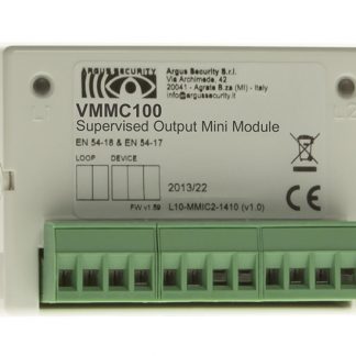 Mini modulo 1 OUT relé 30Vcc/ac 2A supervisionata. EN54-17, EN 54-18. Temperatura di lavoro -10...+55°C. Dimensioni LxHxP 75x52x18mm. Tensione loop 15...40Vcc, 200uA @24Vcc in standby, 6mA@24Vcc in allarme. (VMMC100)