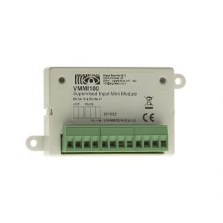 Minimodulo ingresso per rivelatori lineari. Corrente massima pilotabile sull'uscita 1A. EN54-17, EN 54-18. Temperatura di lavoro -10...+55°C. Dimensioni LxHxP 75x52x18mm. Tensione loop 15...40Vcc, 150uA @24Vcc in standby, 16mA@24Vcc in allarme. (VMMI100)