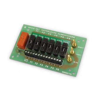 Modulo di distribuzione di alimentazione 12Vcc con 6 uscite protette da fusibili. Dimensioni L130 × H77 × P28mm.
