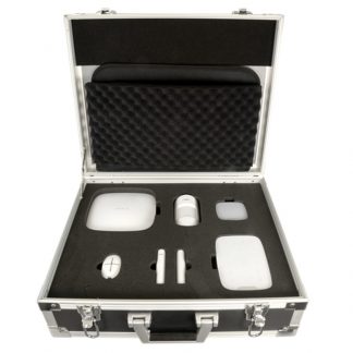 Valigetta metallica dimostrativa - Colore bianco. Serigrafia esterna con logo Ajax - Resistente e di alta qualità - Include kit interamente funzionante - Contenuto: Hub-W (pannello con batteria di riserva), 1 rilevatore di movimento PIR MotionProtect-W, 1 contatto magnetico porta / finestra DoorProtect-W, 1 telecomando SpaceControl-W, 1 tastiera indipendente KeyPad-W e 1 sirena interna HomeSiren-W