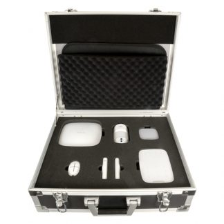 Valigetta metallica dimostrativa - Colore nero. Serigrafia esterna con logo Ajax - Resistente e di alta qualità - Include kit interamente funzionante - Contenuto: Hub-B (pannello con batteria di riserva), 1 rilevatore di movimento PIR MotionProtect-B, 1 contatto porta/finestra magnetico DoorProtect-B, 1 controllo remoto SpaceControl-B, 1 tastiera indipendente KeyPad-B e 1 sirena per interni HomeSiren-B