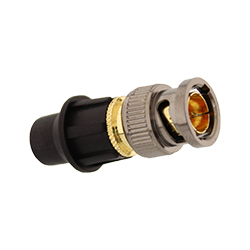 Spina volante BNC maschio con CAP a corredo. Il connettore ottimale per tutte le installazioni di impianti professionali o di broadcasting con telecamere HD-SDI che operano fino a 6 GHz. Ghiera in zinco placcato nichel nero, corpo in ottone placcato oro.