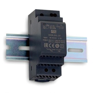 convertitore DC/DC 5A per guida DIN in 16,8-33,6Vcc out 48-56Vcc. Dimensioni LxHxP 40x125,2x113,5mm