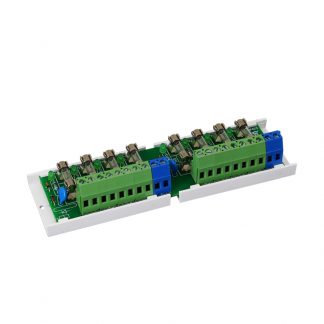 Circuito distribuzione e sezionamento tensione per 8 linee. Consente di dividere e proteggere 8 linee di alimentazione ognuna con fusibile. Segnalazione Led rottura fusibile. Morsettiera per cavi max 2,5mmq. Possibilità di montaggio su guida DIN con accessorio PKAZ107. Dimensioni LxHxP 124x43x20mm