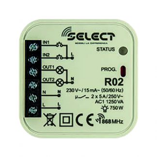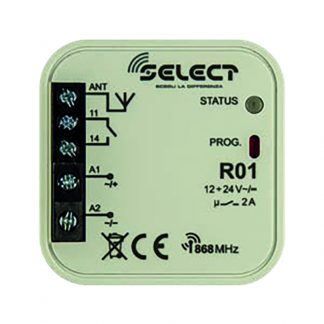 Modulo radio 868 MHz con uscita relè 250V,2A. Utilizzabile per azionare porte garage, cancelli o dispositivi similari. IP20. Conforme alle norme EN60669, EN60950, EN6091000. Dimensioni LxHxP 47,5x47,5x20mm. Temperatura di lavoro -10...+55°C. Alimentazione 12 - 24Vcc/ac, 0,17mA in stand-by.