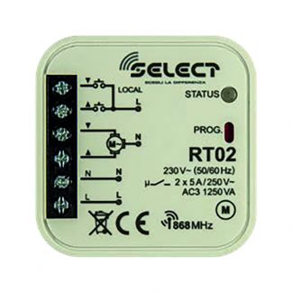 Modulo radio 868 MHz per azionamento di tapparelle, tende avvolgibili o dispositivi simili, dotati di motore elettrico 230 Vac con finecorsa. Può essere installato nelle scatole di derivazione, nella scatola portafrutti o nel cassonetto vicino al motore. Modalità di funzionamento, pulsante filare locale, comando radio locale, comando radio centralizzato. Uscite relè 250V, 5A per comando motore. Temperatura di lavoro -10...+55°C. IP20. Conforme alle norme EN60529, EN60950, EN6091000. Dimensioni LxHxP 47,5x47,5x20mm. Alimentazione 230Vac 50/60Hz 0,4W in stand-by.
