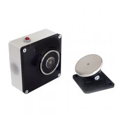 Fermo elettromagnetico in contenitore metallico IP42 per porte tagliafuoco dotato di pulsante di sblocco facilmente individuabile. La costruzione, dal design classico, conferisce al prodotto una elevata robustezza. Un estrattore a molla incorporato permette di vincere il magnetismo residuo assicurando un veloce e affidabile rilascio della porta. Per il collegamento sono disponibili due passacavi per tubi fino a 16mm e un toro posteriore diam. 18mm. Funzionamento a rilascio in mancanza di alimentazione. Connessione a morsetti. In dotazione controplacca con snodo, pulsante sblocco e diodo di protezione. Forza di tenuta 50Kg/490N. Alimentazione 24Vcc 45mA. Dimensioni LxHxP 85x70x43mm