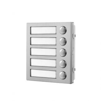 Modulo 5 pulsanti serie 4000 per sistemi VX2300 e IPure, antivandalico (IK07) in acciaio satinato. 5 pulsanti. Placca antivandalica IK07 acciaio inox satinato. Cartellino portanome, retroilluminazione blu. Connettore IDC. Dimensioni 1 modulo. Morsettiera collegamento pulsanti connettore IDC 16 pin. Alimentazione 12 Vdc +/- 10%. Temperatura di lavoro -20 +60°C. Dimensioni: 103 x 120 mm (L x H).
