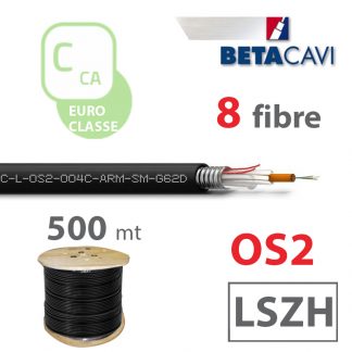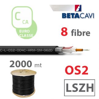 Fibra ottica monomodale tipo Loose con armatura in acciaio INOX corrugato termosaldato, modello OS2, 8 fibre, guaina esterna in LSZH Duraflam® di colore nero, diametro esterno 8,7, per posa in interno, esterno, cavidotti protetti e luoghi pubblici, in Euroclasse Cca, s1b, d1, a1 in bobina da 4000m.