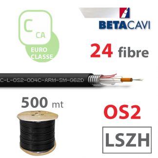 Fibra ottica monomodale Tipo Loose con armatura in acciaio INOX corrugato termosaldato, modello OS2, 24 fibre, guaina esterna in LSZH Duraflam® di colore nero, diametro esterno 8,7, per posa in interno, esterno, cavidotti protetti e luoghi pubblici, in Euroclasse Cca, s1b, d1, a1 in bobina da 500m.