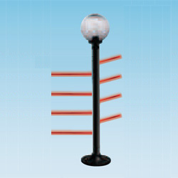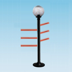 Colonna IR POLITEC modello PARVIS MES (tipo lampione da giardino) per esterno. con tecnologia SMA (single man aligment) consente l'alineamento con un solo operatore in quanto i leds ad altissima luminosità ed il buzzer su ciascuna ottica, permettono il raggiungimento del massimo valore di allineamento senza uso di strumentazione supplementare, viene attivato semplicemente attraverso un pulsante posto su ciascuna ottica. Altezza 1,60mt. 6 raggi 3TX + 3RX. Portata max in interno 400mt; portata max in esterno 100mt. Sincronizzazione filare. Dispositivo di disqualifica automatica in caso di condizioni climatiche estreme. Funzionamento selezionabile AND/OR. Uscita di allarme NC/NO. Funzione RANDOM DELAY che ritarda l'allarme di un tempo variabile. Grado di protezione IP54. Alimentazione raggi 10...30Vcc 135mA, riscaldatori 10...30Vac/cc 30W. Diametro 8cm. PRIVA DI GLOBO