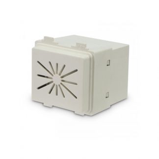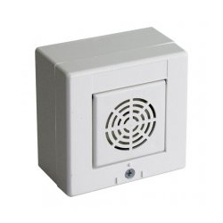 Avvisatore acustico per ambienti interni in termoplastico bianco. Compatto e dal basso consumo. Alimentazione da 3 a 24Vcc: 12Vcc 15mA - 24Vcc 27mA. Suono pulsante 3200 Hz 0,25s ON/0,25s OFF; 98dB 12Vcc - 105dB 24Vcc a 1mt. Connessioni a filo. Dimensioni LxHxP 85x85x47mm