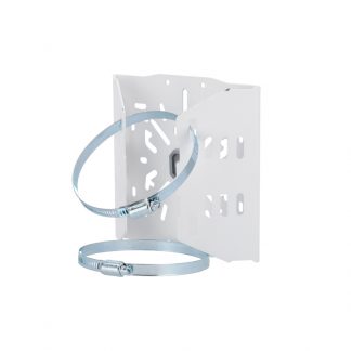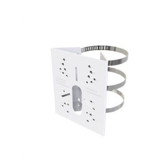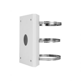Staffa per pali/lampioni, per telecamere bullet o dome. Range diametro 80~150 mm, adatto per esterni. Colore bianco. Corpo in alluminio: Dimensioni: 114 mm (H) x 125,6 (L) x 20 (P) mm.