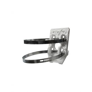 Supporto a palo, compatibilità universale, adatto per esterni, pin cavo. Range diametro 90~110 mm. Materiale: plastica e lega di alluminio. Dimensioni: 105 (H) x 70 (L) x 2 (P) mm. Colore bianco.