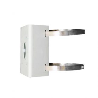 Staffa da palo per telecamere bullet, per esterni. Range diametro 55~127 mm. Colore bianco. Pin cavo. Dimensioni: 99 mm (H) x 90 (L) x 38 (P). Corpo in acciaio.