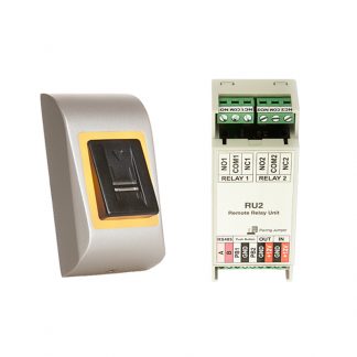 kitb100s - lettore biometrico da esterno 97 impronte + ru2 decodifica 2 rele'. B100-SA-RU2-KIT è un semplice sistema Biometrico Stand Alone per due porte o 2 relè. Si possono programmare fino a 100 impronte (98 utenti + 2 master). Il lettore è dotato di un relè di uscita e in un ingresso per il pulsante di uscita. Per una installazione di sicurezza è necessario collegare il lettore ad una unità a relè posta in un’area sicura.