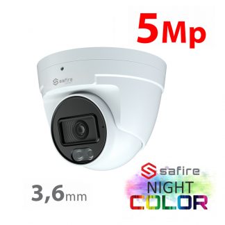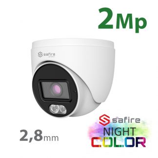 Telecamera Turret SAFIRE SMART 4 in 1, gamma B1 Night Color, 5 Mp ( (2560x1936) , 1/2.5" CMOS. Ottica 3.6mm. Illuminazione LED bianca 30 m, DWDR, HLC, BLC, AGC. Waterproof IP67. Microfono incorporato, audio su cavo coassiale. Alimentazione: DC 12 V / 250 mA, 3W max. Dimensioni: 82.8 (H) x 94.6 (Ø) mm. Corpo in metallo e supporto in plastica. Compatibile con: SF-WALLBRACKET-0203 staffa da parete; SF-JBOX-0106, SF-JBOX-0302 junction box.