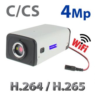 Box camera IP 4Mp, sensore CMOS 1/3". Ottica C/CS. D/N meccanico. Compressione H.265/H.264/MJPEG/AVI. ONVIF 2.4. P2P. WIFI. Allarmi 1in/1out. Audio 1in/1out. RS485. Slot per Micro SD card. Uscita video CVBS per regolazioni da momitor. Temperatura di lavoro -20°...+60°C. Dimensioni LxHxP 79x57x142mm. Peso 585g. Alimentazione 12Vcc, 500mA.