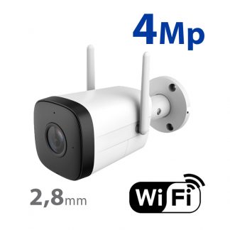 Telecamera bullet IP Wifi 4 Mp, 1/3” Progressive Scan CMOS. Compressione H.265+. Lente 2.8 mm. IR LEDs portata 30 m, WEB, DSS/PSS, Smartphone e NVR. Audio: Microfono integrato e altoparlante. Registrazione su scheda SD fino a 128 GB. Alimentazione: DC 12 V / 6.2 W. Dimensioni: 180 mm (H) x 83.3 mm (L) x 114.8 mm (P).