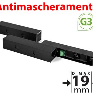 Contatto magnetico a vista AD ALTA TOLLERANZA con morsettiera. Distanza di lavoro su ferro:19mm, su altri materiali: 19mm. Brevetto MAGNASPHERE Coded Sensor Technology permette di creare coppie di sensori e magnete codificati. Alta tolleranza. Scocca in ABS e alluminio anodizzato. Antimascheramento con apertura di circuito tamper indipendente dal contatto principale. Certificato EN50131-2-6 G3 classe IV. Dimensioni magnete e contatto LxHxP 120x25x25mm.