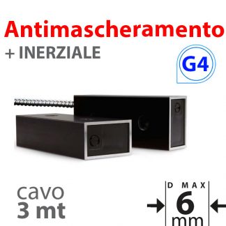 Contatto magnetico a vista QUADRUPLO BILANCIAMENTO con INERZIALE con cavo 3mt. Distasnza di lavoro su ferro:6mm, su altri materiali: 6mm. Brevetto MAGNASPHERE Coded Sensor Technology permette di creare coppie di sensori e magnete codificati. Installazione a vista SENZA VINCOLI di posizionamento. Scocca in ABS e alluminio anodizzato. Antimascheramento con apertura di circuito tamper indipendente dal contatto principale. Certificato EN50131-2-6 grado 4 classe IV. Dimensioni magnete e contatto LxHxP 100x40x25mm.