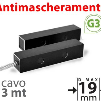 Contatto magnetico a vista AD ALTA TLLERANZA con cavo 3mt. Distanza di lavoro su ferro:19mm, su altri materiali: 19mm. Brevetto MAGNASPHERE Coded Sensor Technology permette di creare coppie di sensori e magnete codificati. Alta tolleranza. Scocca in ABS e alluminio anodizzato. Antimascheramento con apertura di circuito tamper indipendente dal contatto principale. Certificato EN50131-2-6 G3 classe IV. Dimensioni magnete e contatto LxHxP 120x25x25mm.