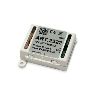 L'Art. 2322 si collega al Bus del sistema digitale VX2300 e permette di avere una sorgente +12Vdc @ 100mA, con la quale è possibile alimentare dispositivi ausiliari senza l'aggiunta di alimentatori addizionali. Es: alimentazione della tastiera digitale Art. 4901 o di altri dispositivi ausiliari. Ingresso linea BUS, voltaggio in uscita +12Vdc – 100mA. Dimensioni (mm) 62x66x22.