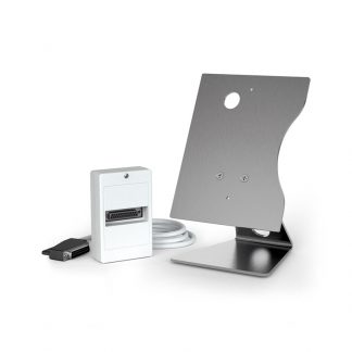 Kit da tavolo per videocitofoni da superficie Serie Kristallo® completo di cavo di connessione e presa a parete. La base è in ACCIAIO INOX spazzolato dallo spessore di 3 mm. Dimensioni: 116 X 183 X 145 mm.