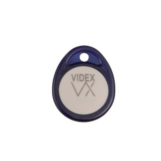 Chiave di prossimità integrata in un portachiavi di materiale plastico, diametro 36mm e spessore 5mm. Colore grigio, personalizzato Videx. Codice a 32 bit e distanza di lettura fino a 20mm (utilizzando lettori Videx).