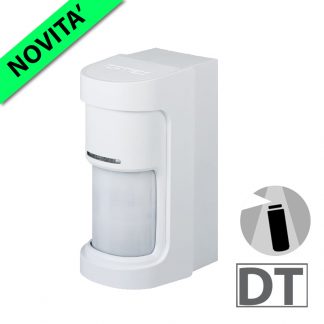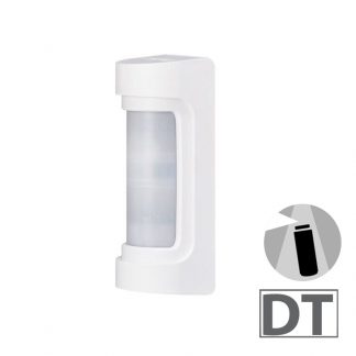 Sensore DT a tenda filare IR+MW da esterno con copertura dagli agenti atmosferici esterni, altezza di installazione 2,10m. Portata fino a 12mt e apertura a 7,5°. Funzione AntiMask IR/MW. Discriminante animali fino a 10Kg. Frequenza MW 24GHz. Portata IR e MW regolabile tramite trimmer. Uscite relè stato solido di allarme, tamper e AM. Segnalazione a led degli eventi di allarme e antimask. Autocompensazione della temperatura. Staffa angolare compresa nella confezione. EN50131-2-4 G2 CL4. IP55. Temperatura di funzionamento -25...+60°C. Dimensioni LxHxP 43x129x90mm. Alimentazione 10...16 Vcc, 25mA. Completo di staffa a 90°.
