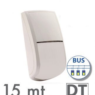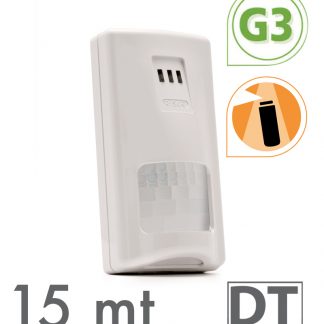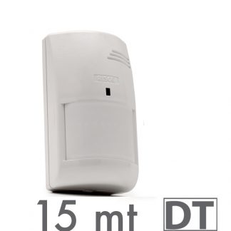 DT2000 è un sensore doppia tecnologia (MW + IR) dalle elevate performance e con un ottimo rapporto prestazioni/investimento. DT2000 offre una copertura fino a 15 metri e l’elevata qualità è certificata dalla garanzia di 5 anni.L’impiego di un sensore PIR digitale garantisce un’elevata immunità ai disturbi e una precisa rivelazione delle condizioni di allarme. Il sensore IR è dotato di una lente FRESNEL con protezione dalla luce bianca mentre la sezione MW è provvista di un’antenna planare DRO a basso assorbimento e di un dispositivo di antimascheramento. DT2000 vanta anche la funzione antistrisciamento. Inoltre l’adozione della completa gestione a microprocessore consente un’analisi accurata dell’ambiente, utilizzando sofisticati algoritmi di calcolo. Il design piacevole, le dimensioni compatte e la possibilità di montaggio ad angolo rendono DT2000 adatto a qualsiasi contesto. Dimensioni: L 65 x H 111 x P 48 mm. Assorbimento: 13mA (a riposo), 13mA (in allarme), 11mA (MW esclusa). Alimentazione: 12V (da 9 a 15V).