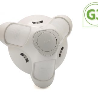 Questo sensore è dotato di una lente grandangolare FRESNEL che gli permette di avere un campo visivo di 360° ad un’altezza massima di 8,5m. Questa caratteristica lo rende particolarmente adatto per uso industriale o commerciale dove l’altezza minima superi i 4m. Sorveglia senza lasciare zone scoperte ed è la soluzione ideale per il controllo totale dell’area. In questo sensore sono combinate due tecnologie, infrarossi dotato di piroelettrico digitale, per la rilevazione del calore corporeo e microonde per la rilevazione del movimento tramite effetto doppler, rendendolo molto stabile ed immune ai falsi allarmi. E’ anche dotato di sensore triassiale con tecnologia MEMS, che rivela spostamenti di circa 20° rispetto alla posizione iniziale di apprendimento. L’altezza minima di installazione consigliabile è di 4,5m mentre la massima è di 8,5m. La massima apertura è di Ø 23m mentre la minima è di Ø 9m (4,5m). Grado di protezione IP40. Alimentazione: da 9 a 16Vcc, assorbimento: 20mA, copertura 360°: altezza da 4,5m a 8,5m max, diametro max 23m. Frequenza MW: 10,525GHz. Uscite: Allarme + Switch antisabotaggio + AC (Warning). Dimensioni max: ø 115 x 31 mm.
