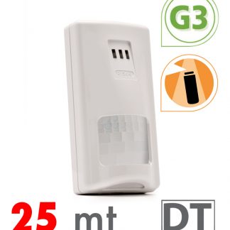 DT4000 è un sensore a doppia tecnologia (MW + IR) ad alte prestazioni in grado di effettuare analisi accurate del segnale ricevuto attraverso l’utilizzo di sofisticati algoritmi. DT4000 garantisce una copertura fino a 15 metri ed è dotato delle funzioni di antimascheramento, antidisorientamento e antistrisciamento.DT4000 vanta l’impiego di un PIR digitale che consente di ottenere alta immunità ai disturbi e precisione di rilevazione. La sezione IR è dotata di una lente FRESNEL con protezione dalla luce bianca e di una lente inferiore antistrisciamento mentre la sezione MW è provvista di un’antenna planare DRO e di un dispositivo di doppio antimascheramento con uscita relè dedicata. Il sensore accelerometrico sempre attivo è in grado di rilevare eventuali tentativi di manomissione. Il design elegante e sobrio, le dimensioni ridotte ed il possibile montaggio ad angolo rendono DT4000 adatto a diversi contesti. DT4000 è certificato IMQ-Allarme EN50131-2-4 grado 3, classe ambientale II. Dimensioni: L 65 x H 111 x P 48 mm. Assorbimento: 15mA (a riposo), 22mA (in allarme), 13mA (stand-by MW esclusa). Alimentazione: 12Vcc.